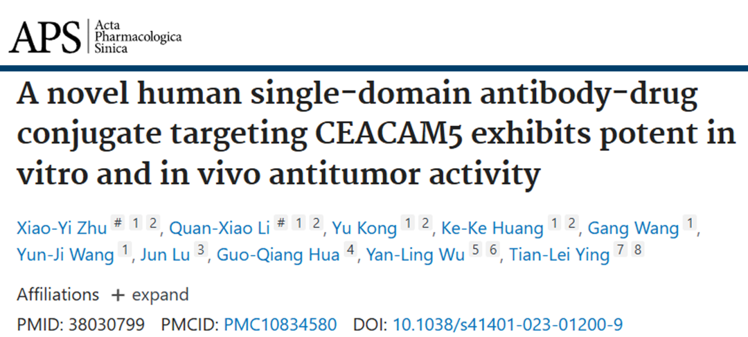 2023年11月29日(当地时间),复旦大学基础医学院应天雷/吴艳玲团队在Acta Pharmacologica Sinica上发表了题为“A novel human single-domain antibody-drug conjugate targeting CEACAM5 exhibits potent in vitro and in vivo antitumor activity”的研究。该研究利用一种全人源单域抗体(UdAbs)与细胞毒性药物结合,针对在多种癌症中高表达的靶点CEACAM5,展示了强大的抗肿瘤活性。