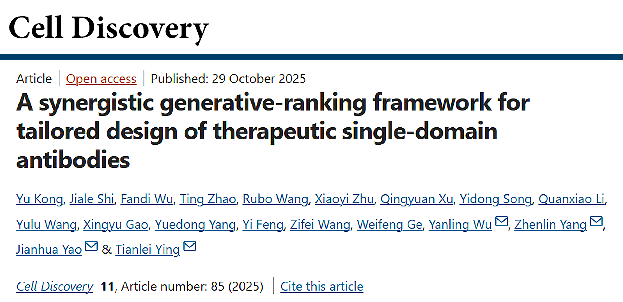 2025年10月29日(当地时间),复旦大学应天雷团队与腾讯AI Lab姚建华团队于期刊Cell Discovery上发表了题为“A synergistic generative-ranking framework for tailored design of therapeutic single-domain antibodies”的研究论文。研究团队开发出基于深度学习的协同生成-排序AI模型TFDesign-sdAb,快速且精准地实现了单域抗体的功能定向生成,在实验验证中功能改造成功率达100%,为AI驱动的抗体理性设计和功能重塑提供了全新的解决方案。
