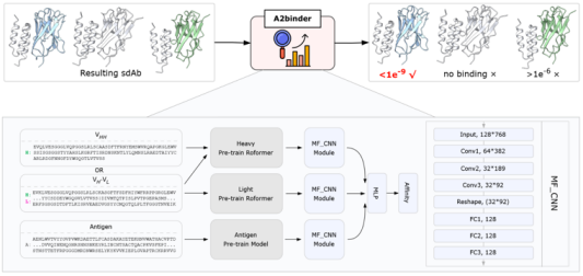 图2. A2binder 模型对单域抗体结合亲和力的预测流程及网络结构示意图