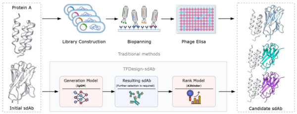 图1. 传统工程化技术与 TFDesign-sdAb在单域抗体功能改造流程的对比示意图